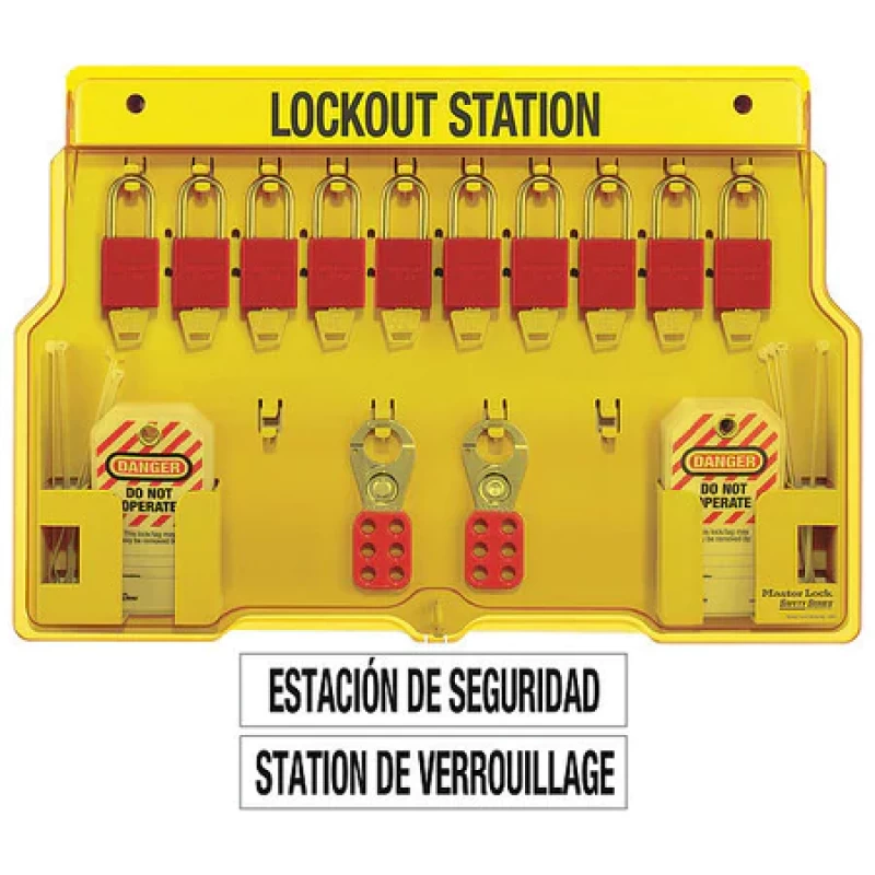 Lockout Station, Filled, Lockout Application General Lockout/Tagout, Number of Components 36, Number of Padlocks Included 10, Included Padlock Body Material Aluminum, Height 15 1/2 in, Width 22 in, Depth 1 3/4 in, Color Yellow, Material Polycarbonate, Max. Number of Padlocks 10, Wall Mounting Yes, Portable No
