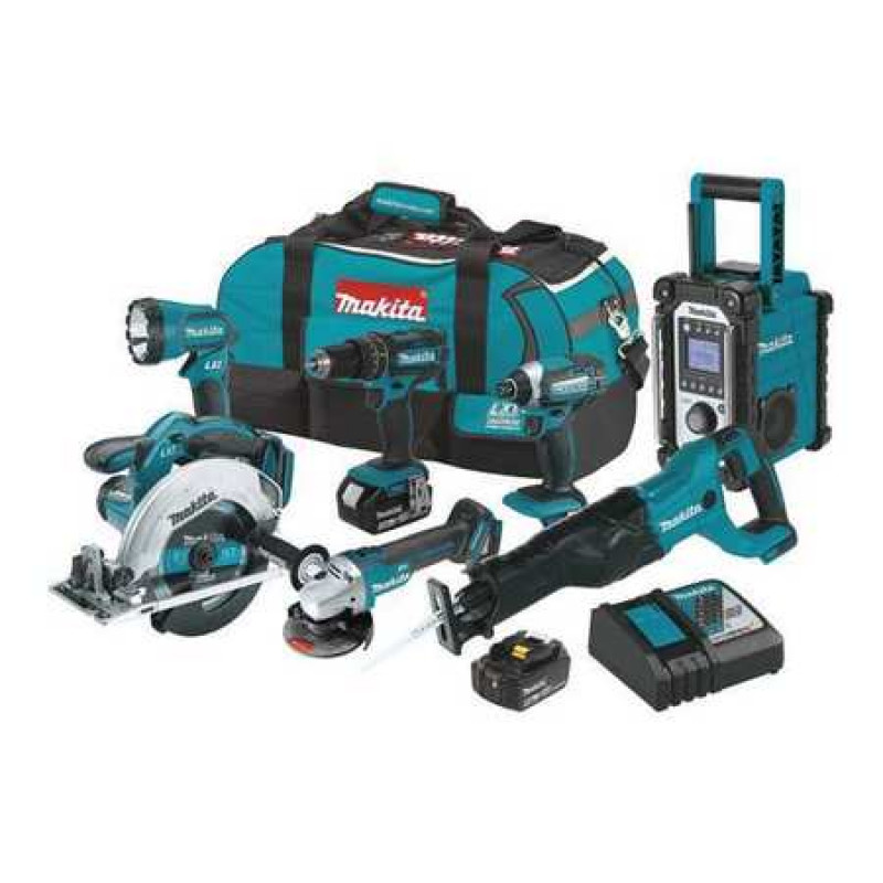 Cordless Combination Kit, Cordless Tools Included Angle Grinder, Circular Saw, Flashlight, Hammer Drill, Impact Driver, Radio, Reciprocating Saw, Voltage 18V DC, Power Source Cordless, Number of Tools 7, Battery Capacity (2) 3.0 Ah, Includes Charger, Contractor Bag, Cordless Circular Saw, Cordless Cut-Off/Angle Grinder, Cordless Flashlight, Cordless Hammer Driver-Drill, Cordless Impact Driver, Cordless Radio, Cordless Reciprocating Saw, Tool Brand Makita, Series LXT, Battery Included Yes