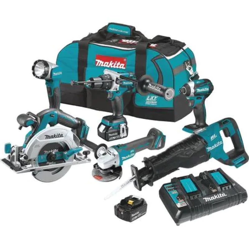 Cordless Combination Kit, Cordless Tools Included Angle Grinder, Circular Saw, Flashlight, Hammer Drill, Impact Driver, Reciprocating Saw, Voltage 18V DC, Power Source Cordless, Number of Tools 6, Battery Capacity (2) 5.0 Ah, Tool Brand Makita, Series 18V LXT, Battery Included Yes, Number of Batteries Included 2, Battery Model No. (2) Mfr. No. BL1850B, Battery Series 18V LXT, Charger Mfr. No. DC18RD, Charger Included Yes, Cordless Tool Kit Contents (5) Bare Tools, (2) Batteries, (1) Charger, (1)