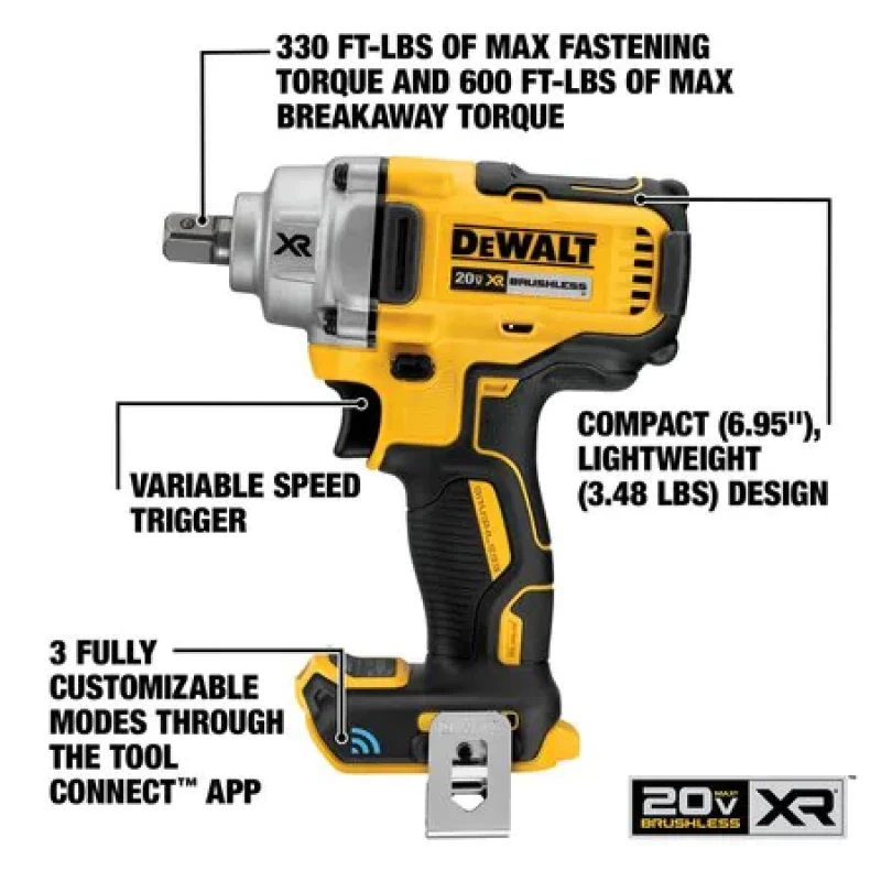 Cordless Impact Wrenches, Impact Wrench, Drive Size 1/2 in Square, Drive Configuration Straight, Max. Torque 330 ft-lb, Bare Tool, Voltage 20V DC, Series 20V MAX, Cordless Tool Battery Type Li-Ion, Brushless Motor Yes, Anvil Impact Action Mechanical, Max. Blows per Minute 3100, Max. No Load RPM 2000, Cordless, Handle Type Pistol Grip, Tool Length 6-61/64 In., Tool Weight 3.5 lb, Clutch Style Detent Pin Anvil, Battery Included No, Battery Pack Replacement Mfr. No. DCB205