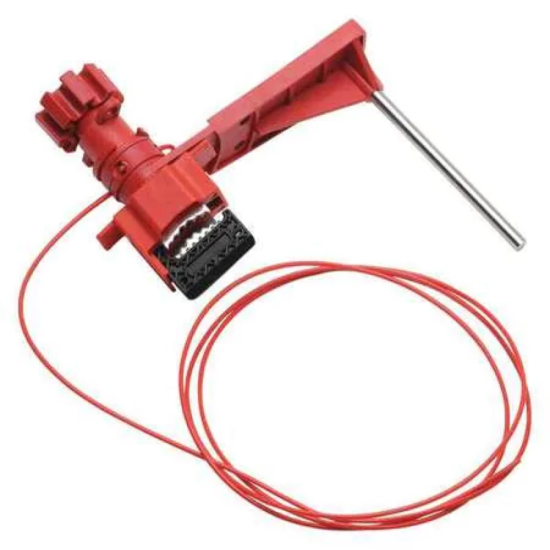 Universal Valve Lockout, Red, Material Steel, Max. Number of Padlocks 1, Padlock Shackle Max. Dia. 9/32 in, Handle Thickness 1 3/32 in, Handle Width 1 19/32 in, Height 2 in, Width 7 in, Length 6 in, Temp. Range 0 Degrees to 250 Degrees F, For Use With Large Levers, T-Handles, Hard-to-Secure Mechanical Devices, Includes 8 ft Nylon Cable, Blocking Arm