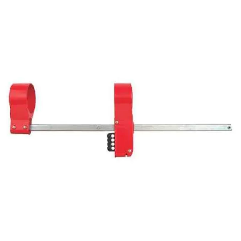 Blind Flange Lockout Device, Color Red/Black/Silver, Nut Dia. 2.000 in to 2.750 in, Fits Pipe Size 14 in to 24 in, Flange Size 7-3/4 in to 17-7/8 in, Max. Number of Padlocks 4, Padlock Shackle Max. Dia. 5/16 in, Material Aluminum/Steel, For Use With Pipelines, Standards OSHA 1910.147
