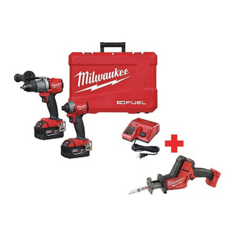 Cordless Combination Kit, Voltage 18.0, Number of Tools 3, Cordless Tools Included Hammer Drill, Impact Driver, Reciprocating Saw, Cordless Tool Battery Type Li-Ion, Series M18 FUEL(TM), 483A47 Hammer Drill, 481H96 Impact Driver, 419J60 Reciprocating Saw, 23Y581 Charger, 35GJ99 Battery Included, Battery Capacity 5.0Ah, Battery Pack Replacement 35GJ99, Carrying Case Kit Box, Includes (2) Belt Clip, (2) Bit Holder, Side Handle
