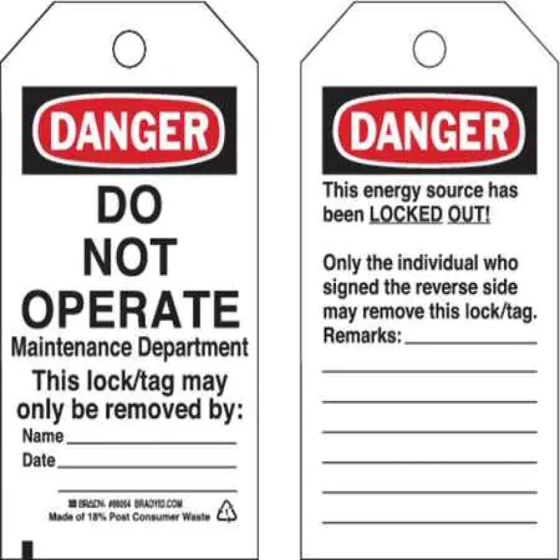 Danger Tag, Material Cardstock, Legend Do Not Operate Maintenance Department This Lock/Tag May Only Be Removed By, Height 5 3/4 in, Width 3 in, Withstand Pull Force 50 lb, Hole Size 3/8 in, Header Danger, Legend Color Black, Background Color White, Legend Style Text, Write on Surface Yes