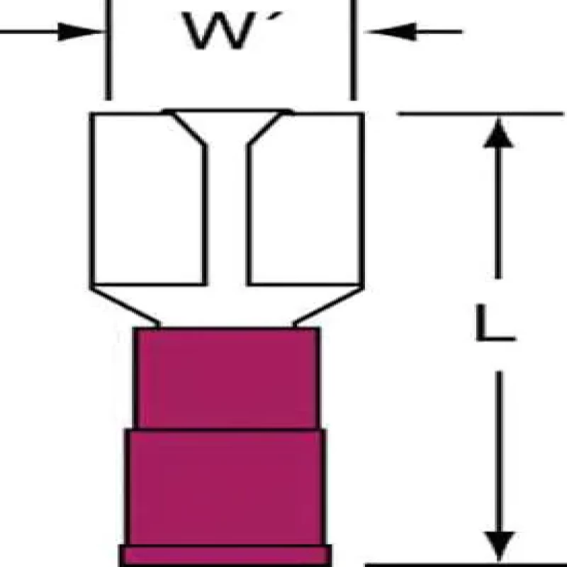 Female Disconnect, Insulation Partial, Insulation Type Nylon, Insulation Color Red, Wire Range 22 to 18 AWG, Tab Size 0.032 in x 0.250 in, Barrel Inside Dia. 0.08 in, Max. Temp. 221 Degrees F, Max. Voltage 600 V, Overall Length 0.86 in, Seam Butted, Connection Material Tin-Plated Brass, Standards CSA Certified, RoHS Compliant, UL Listed, Connection Type Crimp, Package Quantity 1000