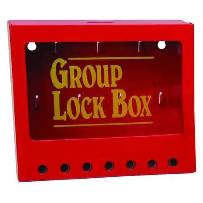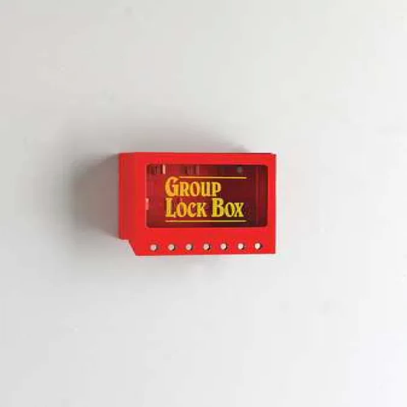 Group Lockout Box, Max. Number of Padlocks 7, Sliding Door Type, Red, Portable No, Steel, Height 7 in, Width 8 in, Depth 2 1/4 in, Wall Mounting Yes, Legend Group Lock Box