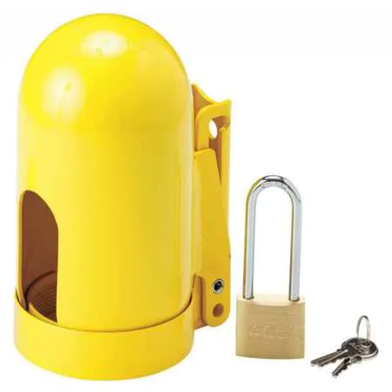 Locking Cylinder Cap, Fine Thread, Size 9-31/32 in H x 5 in W, Color Yellow, Material Steel, Includes (1) Lockout Device; (1) Brass Padlock with 3 Keys, Standards OSHA 1910.147, ANSI Standard Z244, Meets DOT Standards, Neck Ring Diameter 3 7/8 in, Padlock Shackle Max. Dia. 3/8 in, Max. Number of Padlocks 1, Cylinder Lockout Pressure Type Low, Thread Size 11 UNF, OSHA Compliant Yes
