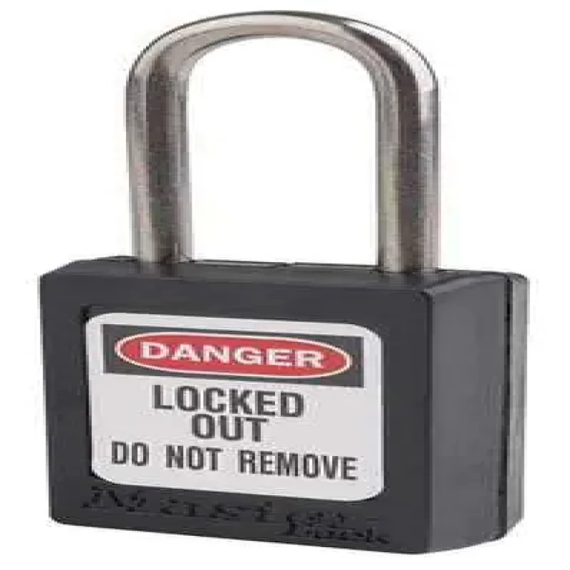 Lockout Padlock, Key Type Alike, Body Material Thermoplastic, Shackle Dia. 3/16 in, Shackle Height 1 1/2 in, Shackle Material Stainless Steel, Shackle Width 5/8 in, Body Width 1 3/8 in, Body Height 1 13/16 in, Body Color Black, Shackle Type Open