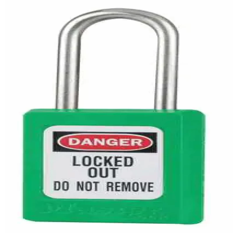 Lockout Padlock, Key Type Alike, Body Material Thermoplastic, Shackle Dia. 3/16 in, Shackle Height 1 1/2 in, Shackle Material Stainless Steel, Shackle Width 5/8 in, Body Width 1 3/8 in, Body Height 1 13/16 in, Body Color Green, Shackle Type Open