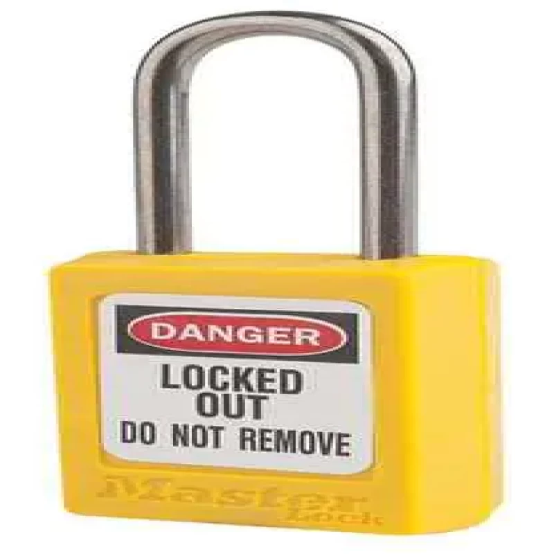 Lockout Padlock, Key Type Alike, Body Material Thermoplastic, Shackle Dia. 3/16 in, Shackle Height 1 1/2 in, Shackle Material Stainless Steel, Shackle Width 5/8 in, Body Width 1 3/8 in, Body Height 1 13/16 in, Body Color Yellow, Shackle Type Open, Package Quantity 12