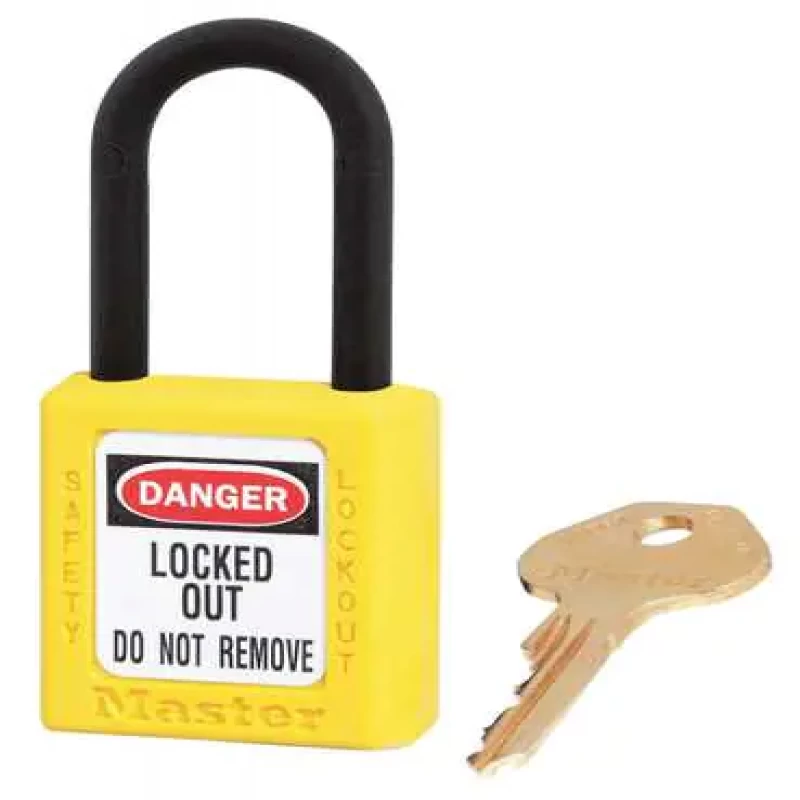 Lockout Padlock, Key Type Alike, Body Material Thermoplastic, Shackle Dia. 1/4 in, Shackle Height 1 1/2 in, Shackle Material Plastic, Shackle Width 25/32 in, Body Width 1 1/2 in, Body Height 1 3/4 in, Body Color Yellow, Shackle Type Open, Package Quantity 6