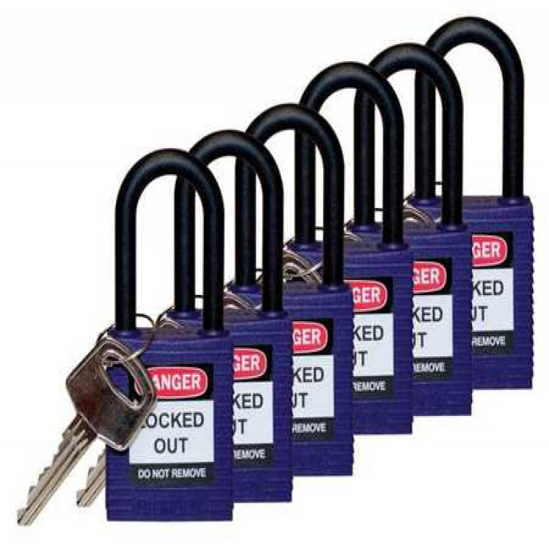 Lockout Padlock, Key Type Different, Body Material Thermoplastic, Shackle Dia. 1/4 In., Shackle Height 1-1/2 In., Shackle Material Plastic, Shackle Width 3/4 In., Body Width 1-1/2 In., Body Thickness 4/5 In., Legend Danger Locked Out Do Not Remove, Includes English, Spanish, French Lockout Labels, Standards OSHA 1910.147, Body Height 1-3/4 In., Body Color Purple, Control Key Registration Required No, Shackle Type Open, Number of Keys 1, Number of Pins 6, Padlock Body Shape Rectangular