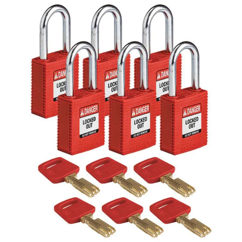 Lockout Padlock, Key Type Different, Body Material Nylon, Shackle Dia. 1/4 in, Shackle Height 1 1/2 in, Shackle Material Steel, Shackle Width 13/16 in, Body Width 1/2 in, Body Thickness 3/4 in, Legend Danger Locked Out Do Not Remove, Includes (6) Padlocks, (6) Keys, Standards OSHA 29 CFR 1910.147, Body Height 1 13/16 in, Body Finish Thermoplastic, Body Color Red, Shackle Type Open, Number of Bumpers 0, Control Key Registration Required No,