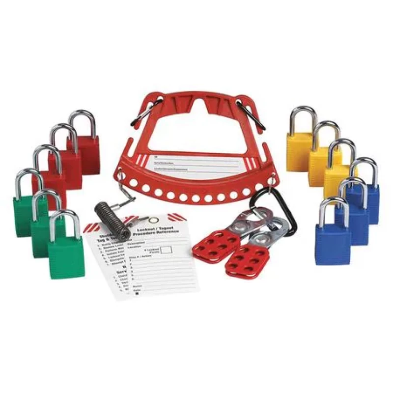 Lockout Padlock, Key Type Alike, Body Material Steel, Shackle Dia. 1/4 in, Shackle Height 1 1/2 in, Shackle Material Steel, Shackle Width 5/8 in, Body Width 1 1/2 in, Body Thickness 13/16 in, Legend ID#, Name, Location, Lockout, Tagout Procedure Reference, Includes Carrier with (3) Clips, Key Holder, (2) Safety Hasps, (3) Red Safety Locks, (3) Yellow Safety Locks, (3) Green Safety Locks, (3) Blue Safety Locks, (3) LO Procedure Template Tags, Body Height 1 3/4 in, Body Finish Plated