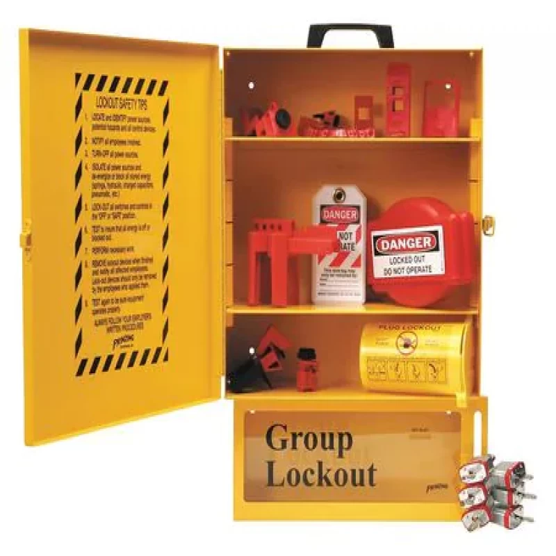 Lockout Station, Filled, Lockout Application Electrical Lockout, Number of Components 30, Number of Padlocks Included 6, Included Padlock Body Material Steel, Height 16 in, Width 14 in, Depth 6 in, Color Black/Yellow, Material Metal, Max. Number of Padlocks 10, Wall Mounting Yes, Portable Yes