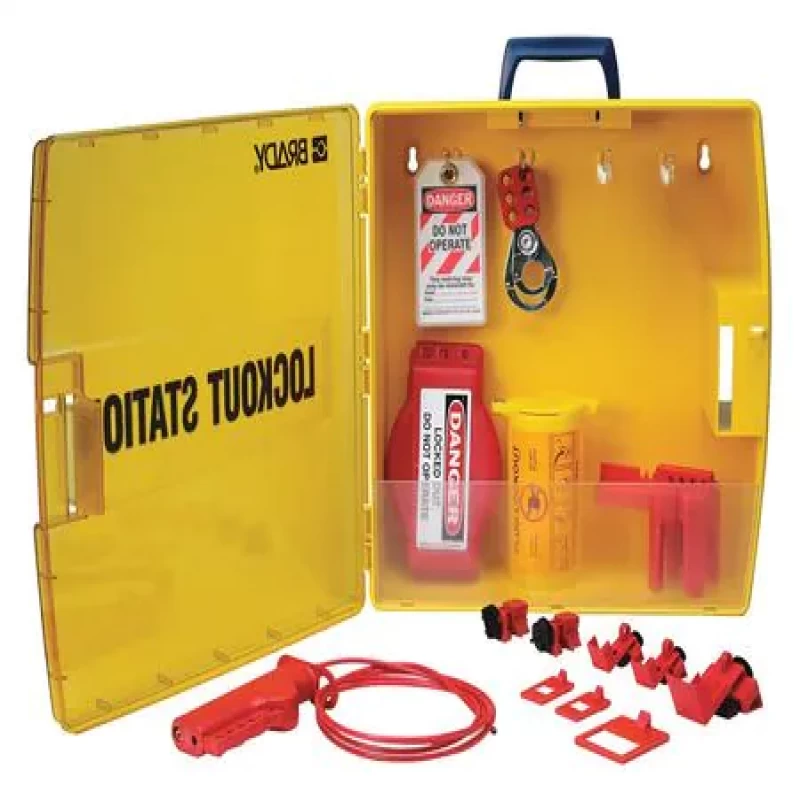 Lockout Station, Filled, Lockout Application Electrical/Valve Lockout, Number of Components 19, Number of Padlocks Included 0, Height 17 in, Width 17 in, Depth 6 3/4 in, Color Yellow, Material Polypropylene, Wall Mounting Yes, Portable Yes