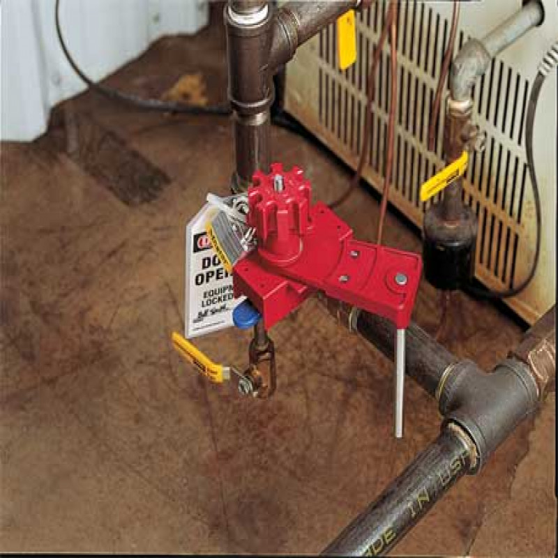 Lockout Valve Base, Red/Black, Material Steel/Nylon, Fits Handle Size 1-19/32 in, Max. Valve Handle Thickness 1 7/64 in, Max. Number of Padlocks 2, Padlock Shackle Max. Dia. 3/8 in, Temp. Range 0 Degrees to 250 Degrees F