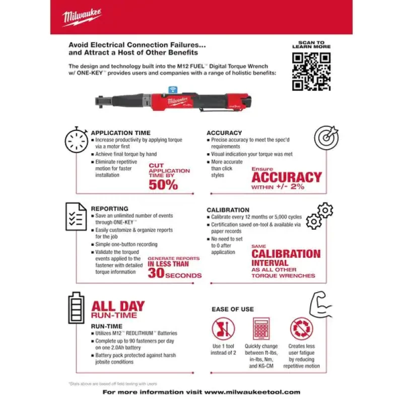 The MILWAUKEE® M12 FUEL™ ?” Digital Torque Wrench w/ ONE-KEY™ is the industry's first torque wrench with a motor, delivering increased productivity, precise torque accuracy, and user demanded reporting functionality. The ?” torque wrench delivers 50% faster installation time, replacing the hand tool or two tool installation process and providing more control to reduce the over torquing of fasteners.The ?” digital torque wrench provides 10-100ft-lbs of torque range and accuracy within 2% for torque critical fasteners. This battery powered torque wrench is equipped with Milwaukee ONE-KEY™ giving users the power to track, report, and manage their tool. This tool will record all of the fasteners that are saved and produce a downloadable report via ONE-KEY™ for the necessary parties requiring the data. ONE-KEY™ allows users to wirelessly connect to a smartphone to customize the tool settings, track its location, manage inventory, and lock the tool out for added security and protection for their investment.