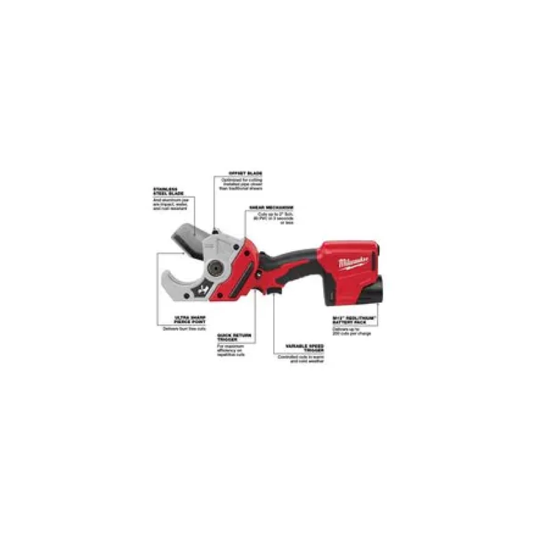 The MILWAUKEE® M12™ Plastic Pipe Shear cuts cleaner, faster, closer, and longer than traditional plastic pipe shears with over 200 cuts on one battery charge. The M12™ Plastic Pipe Shear can cut through 2” schedule 80 PVC in three seconds or less. Its razor-sharp pierce-point leaves pipe and tubing clean, burr-free, and ready for installation, minimizing the time spent on the job. Instantly open the jaw to increase productivity in repetitive cuts by using the tool’s quick blade release. Professionals can expect more work from this cordless shear with a 3mm stainless steel blade and aluminum jaw that resists impact, water, and rust. This Milwaukee pipe shear is powered by an M12™ REDLITHIUM Battery for more power and a longer run-time for maximum cuts per charge. The on-board battery fuel gauge helps monitor the charge status, so there’s less downtime on the job.