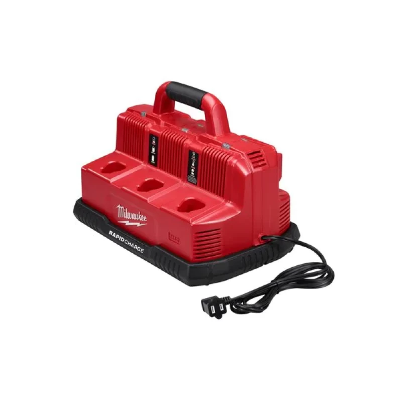 The M18™ & M12™ rapid charge station is the fastest charging solution in the industry. With the ability to charge 6 packs 4X faster, the station charges three batteries simultaneously while charging each pack up to 40% faster. The charger accepts up to (3) M18™ & (3) M12™ battery packs, reducing the amount of time spent changing out batteries and increasing productivity on the jobsite. Featuring REDLINK™ Intelligence, it communicates directly with the battery to monitor cell voltage, temperature, and charge status to optimize the performance and extend the life of the pack. The station has integrated hang holes for vertical mounting, a pass through plug to conserve outlet space, and a convenient carry handle to transport packs on and off the jobsite.