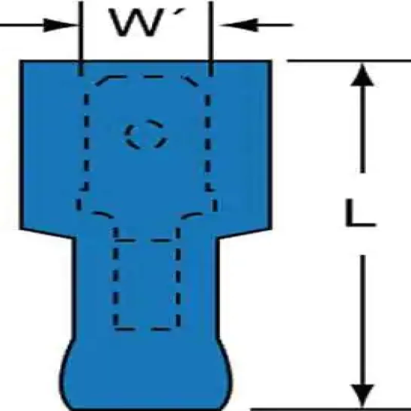 Male Disconnect, Insulation Full, Insulation Type Nylon, Insulation Color Blue, Wire Range 16 to 14 AWG, Tab Size 0.020 in x 0.187 in, Barrel Inside Dia. 0.08 in, Max. Temp. 221 Degrees F, Max. Voltage 600 V, Overall Length 0.87 in, Seam Butted, Connection Material Tin-Plated Copper, Standards CSA Certified, RoHS Compliant, UL Listed, Connection Type Crimp, Package Quantity 1000