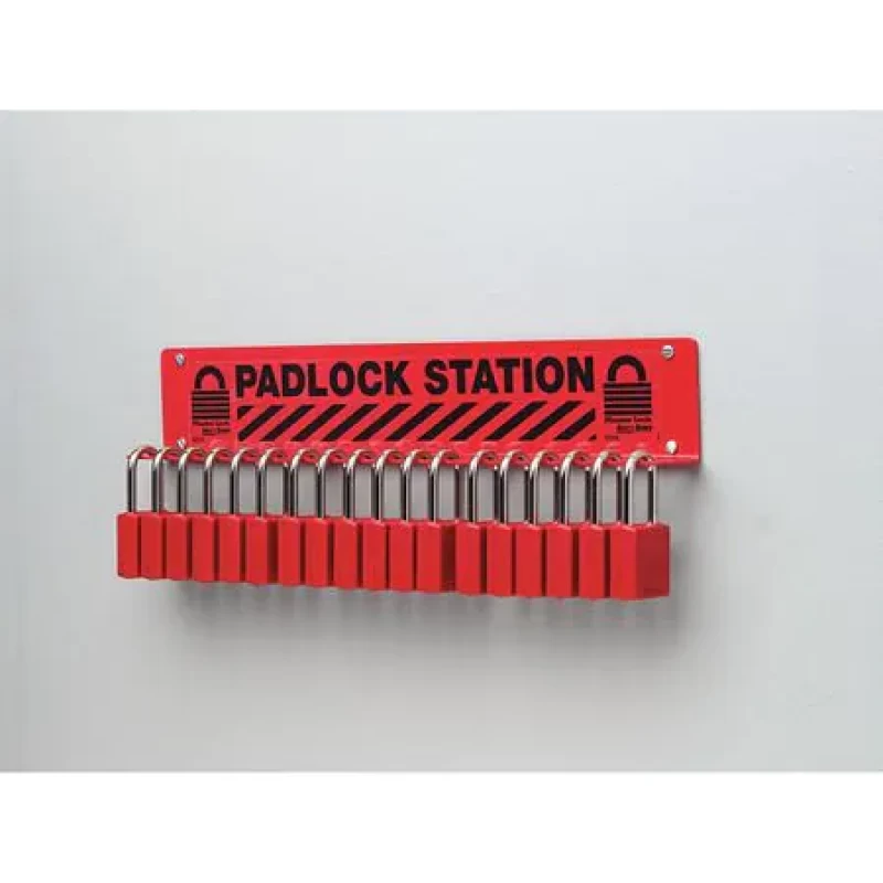Padlock Station, Unfilled, Number of Components 0, Number of Padlocks Included 0, Height 3 in, Width 6 1/4 in, Depth 1 1/2 in, Color Red, Material Steel, Max. Number of Padlocks 8, Wall Mounting Yes, Portable No