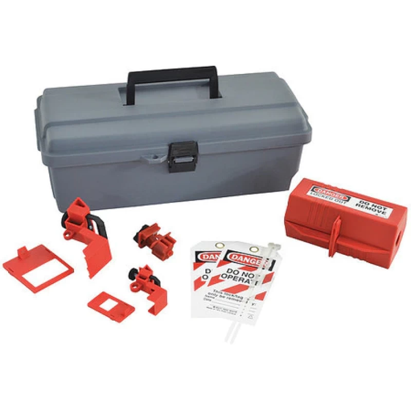 Portable Lockout Kit, Filled, Portable Yes, Lockout Application Electrical Lockout, Number of Components 29, Number of Padlocks Included 0, Case Style Tool Box, Gray, Case Height 14 in, Case Width 5 1/4 in, Case Depth 6 1/2 in, Case Material Plastic, Language English