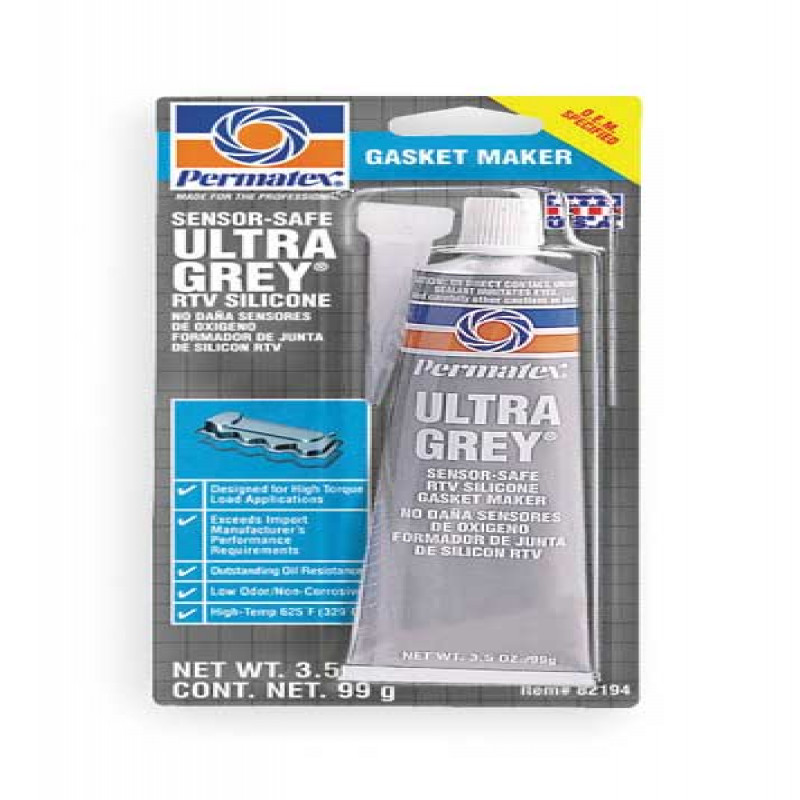 RTV Silicone Sealant, Rigid High Torque, 3.5 oz, Gray, Temp. Range -65 to 500 Degrees F, Specific Gravity 1.5, Viscosity Paste, Flash Point 200 Degrees F, Full Cure 24 hr, Begins to Harden 1 hr, Substrates Aluminum, Brass, Glass, Iron, Plastic, Steel, Stone, Wood, High Load Engine Conditions With Closely Spaced Bolt Patterns, Oil and Water-Glycol Resistance, Used for Pump Housings, Machine Tools, Compressors, Gearboxes, Transmission and Oil Pans, and Valve Covers