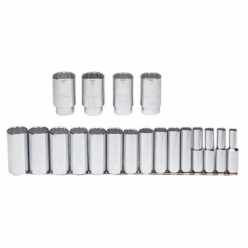 These SAE socket sets come with drive tools and an assortment of sockets and socket bits for a range of fastener sizes. They come in sizes that are measured in inches and fractions of an inch to fit fasteners with an SAE (inch) size head.