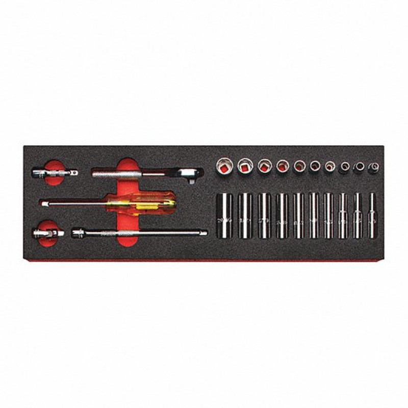 These SAE socket sets come with drive tools and an assortment of sockets for a range of fastener sizes. They come in sizes that are measured in inches and fractions of an inch to fit fasteners with an SAE (inch) size head.