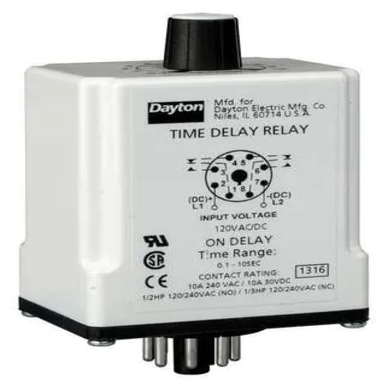 Single Function Time Delay Relay, Function - Timing Relay On Delay, Coil Volts 120V AC, AC Contact Rating - Relay 10A @ 240V, DC Contact Rating - Relay 10A @ 30V, Base Type - Plug In Relay Octal, Number of Pins - Relay 8, Mounting - Relay Plug In, Contact Form - Relay DPDT, Power Consumption - Relay 2.0 VA, Adjustment Method - Timer Potentiometer, Min. Time Setting - Timer 9.0 sec, Max. Time Setting - Timer 15 min, Status Indicator None, Contact Material Silver Nickel