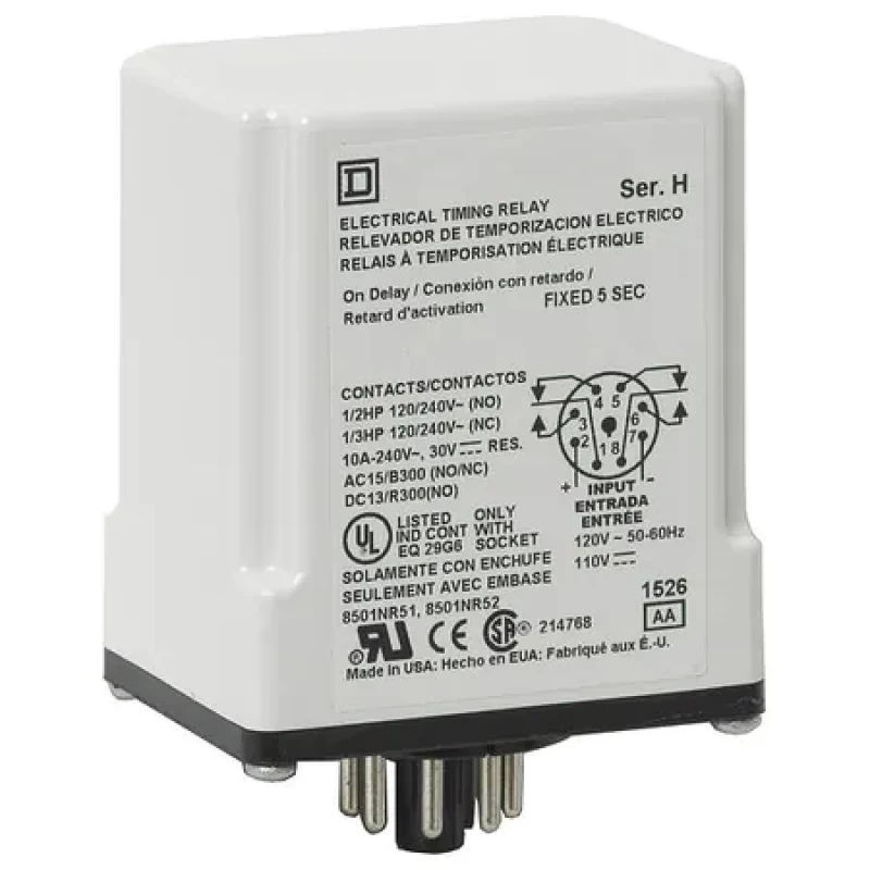 Time Delay Relay, Function - Timing Relay On Delay, Coil Volts 110V DC, 120V AC, AC Contact Rating - Relay 10A @ 120V, DC Contact Rating - Relay 10A @ 110V, Base Type - Plug In Relay Octal, Number of Pins - Relay 8, Mounting - Relay Plug In, Contact Form - Relay DPDT, Power Consumption - Relay 2.0 VA, Socket Code - Relay A, Contact Material Silver Nickel