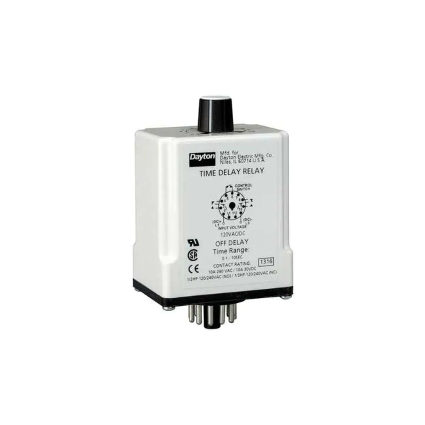 Time Delay Relay, Function - Timing Relay Repeat cycle, Coil Volts 110V DC, 120V AC, AC Contact Rating - Relay 10A @ 240V, DC Contact Rating - Relay 10A @ 110V, Base Type - Plug In Relay Octal, Number of Pins - Relay 8, Mounting - Relay Plug In, Contact Form - Relay DPDT, Power Consumption - Relay 2.0 VA, Adjustment Method - Timer Rotary Knob, Socket Code - Relay A, Status Indicator None, Contact Material Silver Nickel
