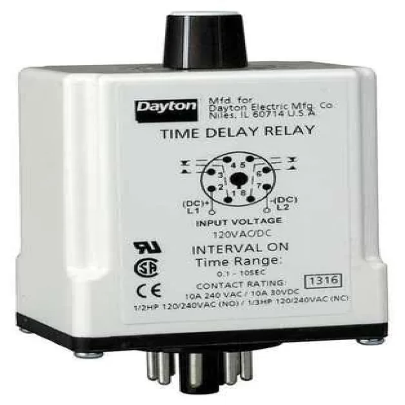 Single Function Time Delay Relay, Function - Timing Relay Interval On, Coil Volts 240V AC, AC Contact Rating - Relay 10A @ 240V, DC Contact Rating - Relay 10A @ 30V, Base Type - Plug In Relay Octal, Number of Pins - Relay 8, Mounting - Relay Plug In, Contact Form - Relay DPDT, Power Consumption - Relay 2.0 VA, Adjustment Method - Timer Potentiometer, Min. Time Setting - Timer 3.0 sec, Max. Time Setting - Timer 5 min, Status Indicator None, Contact Material Silver Nickel