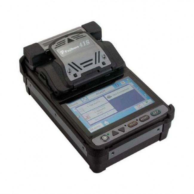 • The Fujikura 41S is a fully ruggedized, two camera, active cladding alignment fusion splicer. Core sensing loss estimation technology provides the most accurate assessment of splice loss available in any active cladding alignment splicer in the world. Enabled by Warm Splice Imaging (WSI), the 41S can determine the accuracy of core alignment by evaluation of the splice during the heating process. This technology delivers splice loss estimates with a greater level of accuracy than those based on only cladding alignment. State-of-the-art cleaver management via Bluetooth® connection with the CT50 Cleaver tracks usage and enables automated blade rotation as needed. The dual-camera, active V-groove alignment system provides consistent splicing performance in the most challenging conditions. A 6-second splice time and 25-second shrink time offers unmatched speed and productivity, while an easy-to-use touchscreen monitor provides simple and intuitive menu navigation. Interchangeable sheath clamps or fiber holders provide versatility for user preference, and compatibility with fusion installable connectors. The extended-life battery is rated for up to 200 splice and heat cycles. Long-life electrodes, lasting 5,000 splices, help minimize downtime for replacement and stabilization. The large 5" monitor provides a crystal clear image, even in the brightest sunlight. Software updates are accomplished via the internet allowing users to quickly update their software as new splice programs become available