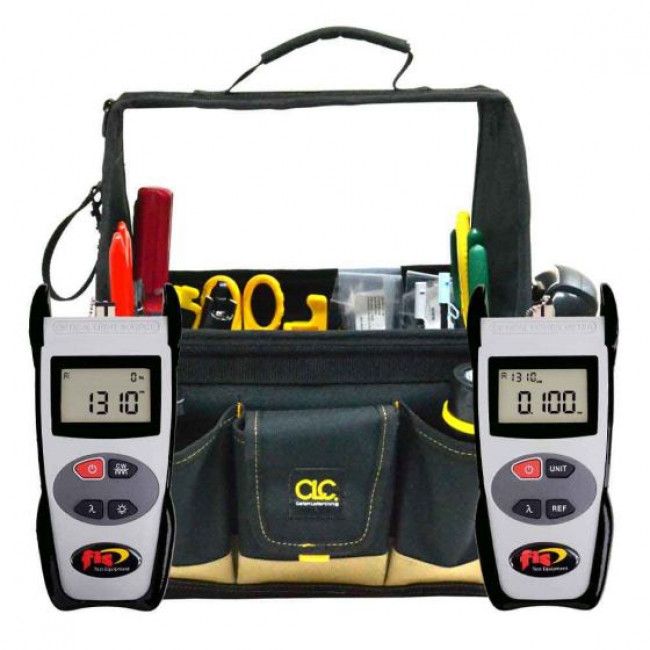 Visual Fault Location w/ 1.25mm adapter, 25ft tape measure, LED flash light and FIS cleaning supplies. The padded handle and adjustable shoulder strap make